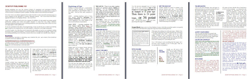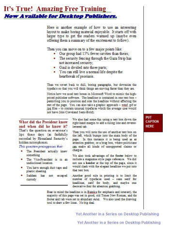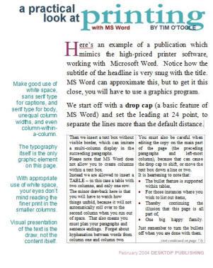 Another one-page summary of some of the more useful techniques in giving your printed words new vitality And just two or three fonts handle the entire page.Times Roman for body copy (most readable for smaller print), Arial for headings,and just a smidge of a display font to wrap things up (one-page PDF file.